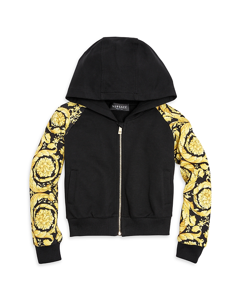 Versace Girls' Barocco Zip Hoodie - Big Kid - Size - 8Versace Girls' Barocco Zip Hoodie - Big Kid.Color:Black/Gold.Size:8.Material:100% cotton; trim: 95% cotton/5% elastane.Hoodies & Sweatshirts.Versace