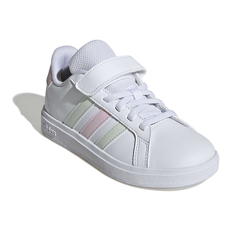 adidas Grand Court Lifestyle Kids' Shoes, Girl's, Size: 3, Green Clear PinkClassic adidas shoes for kids' fast-moving feet. They're ready for the park or the playground, with elastic laces and a hook-and-loop strap for easy on and off. The synthetic leather upper can withstand plenty of stomping, swinging and puddle-jumping. SHOE FEATURES Made with a series of recycled materials, this upper fadidas