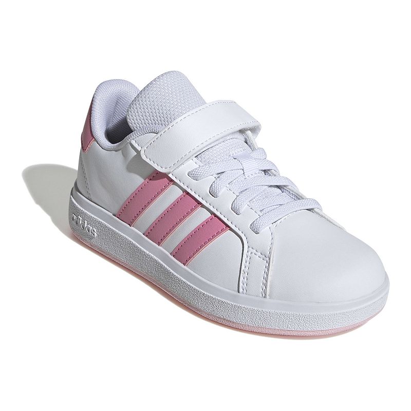 adidas Grand Court Lifestyle Kids' Shoes, Girl's, Size: 13, White Bliss PinkClassic adidas shoes for kids' fast-moving feet. They're ready for the park or the playground, with elastic laces and a hook-and-loop strap for easy on and off. The synthetic leather upper can withstand plenty of stomping, swinging and puddle-jumping. SHOE FEATURES Made with a series of recycled materials, this upper fadidas