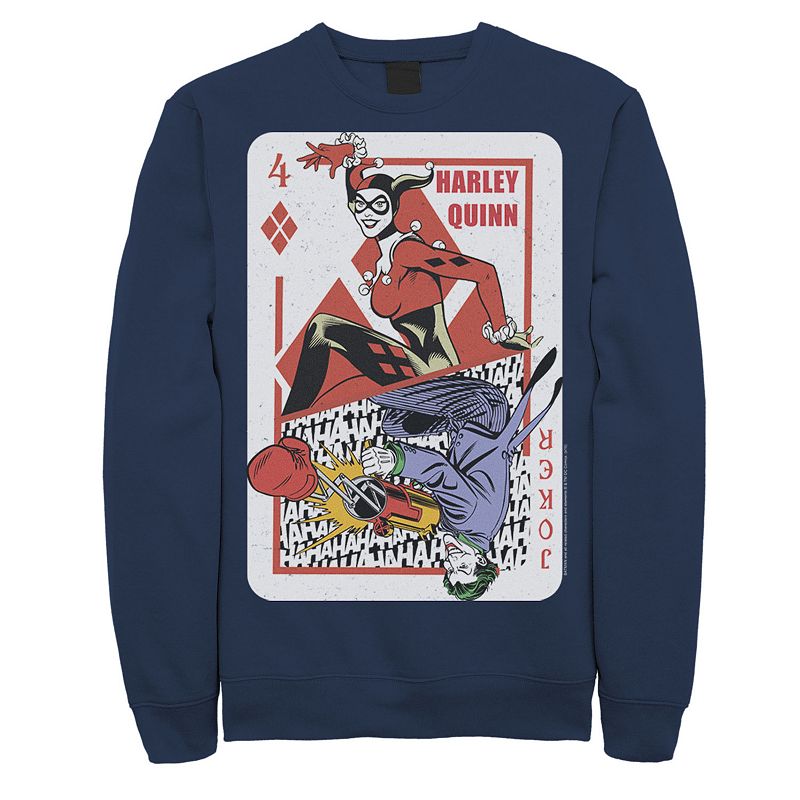 Mens DC Comics Harley Quinn Joker Playing Card Sweatshirt, Men's, Size: Large, BlueIf you play your cards right, this men's Harley Quinn sweatshirt could be yours. If you play your cards right, this men's Harley Quinn sweatshirt could be yours.Click on this MEN'S GUIDE to find the perfect fit and more! Crewneck Long sleevesFABRIC & CARE Cotton, polyester Machine wash Imported Color: Navy. Gender: malDC Comics
