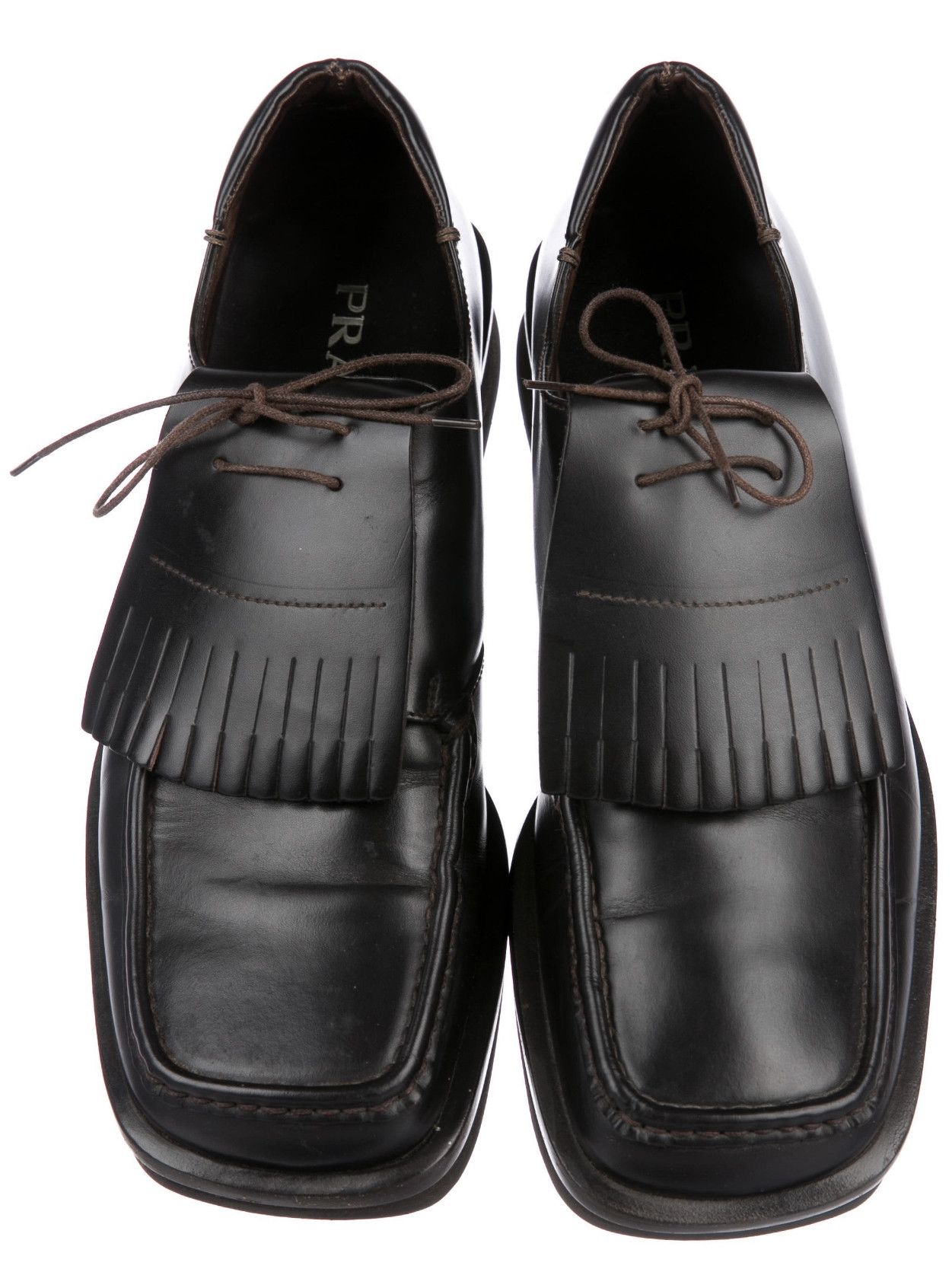 Prada Leather Kiltie Oxford Shoes, Walnut Brown, Italy Shoes, Men's (Size 9.5)Prada Leather Kiltie Oxford Shoes, Walnut Brown, Italy. Size 42.5. Fits A Bit Large, So Around 43 And Even Up To 43.5. Super Cool Prada Square Toe. Nerd-Chic. 1" Platform. | Prada Leather Kiltie Oxford Shoes, Walnut Brown, Italy Shoes, Men's (Size 9.5)Prada