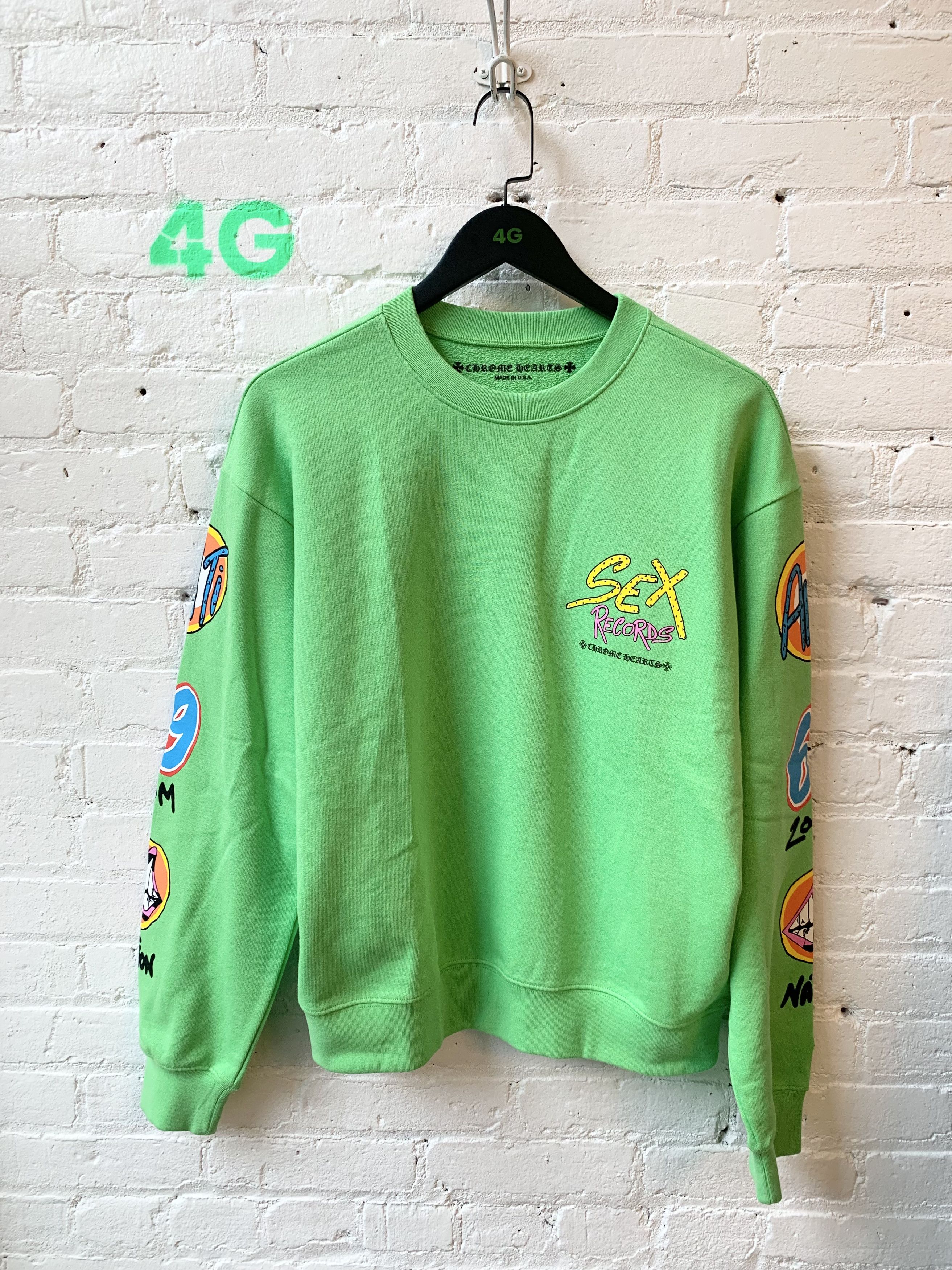Chrome Hearts Lime Green Sex Records Crew Neck Sweater Size M, Men'sSex Records By Matty Boy Small Print On Chest Large Print On Back Sleeves Printed Top To Bottom Sz M | Chrome Hearts Lime Green Sex Records Crew Neck Sweater Size M, Men'sChrome Hearts