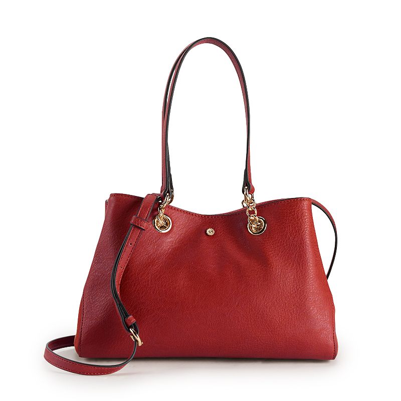 LC Lauren Conrad Amanda Chain Satchel Crossbody Bag, Raina RedCarry your personal effects around in style with this gold tone chain-accented satchel from LC Lauren Conrad. DETAILS 11.75"W x 7.5"H x 4.25"D 8.75'' drop handle Snap closure Gold tone hardware Interior: 2 zip pockets, 2 slip pocketsCONSTRUCTION & CARE Body: PU, polyester Lining: polyester Wipe clean Imported Size: OneLC Lauren Conrad