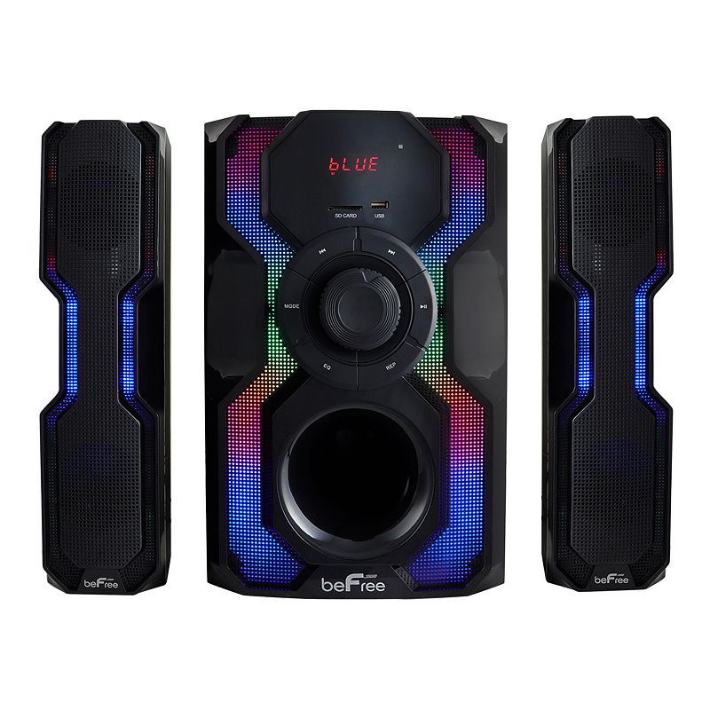 beFree Sound 2.1 Channel Bluetooth Multimedia Wired Speaker Shelf Stereo System with Reactive LED Lights & FM Radio, BlackWith high quality sound and a visual light display there's a lot to love about this beFree Sound Bluetooth 2.1 Channel Wired Speaker Shelf System. With high quality sound and a visual light display there's a lot to love about this beFree Sound Bluetooth 2.1 Channel Wired Speaker Shelf System. Connect to your audio devibeFree Sound
