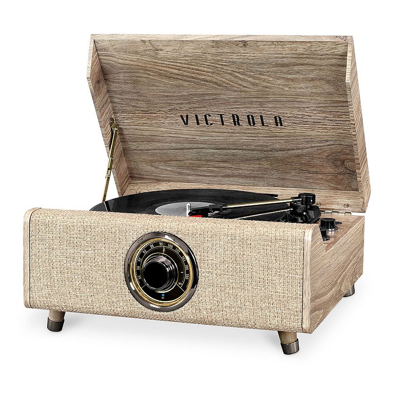 Victrola 4-in-1 Highland Bluetooth Record Player with 3-Speed Turntable & FM Radio, Farmhouse OatmealVictrola?s Highland 4-in-1 record player captures the spirit of mid-century style. Victrola?s Highland 4-in-1 record player captures the spirit of mid-century style. Belt driven 3-speed turntable (33 1/3, 45, 78 RPM) plays all of your favorite vinyl records Classic FM radio with analog tuner & around the dial LED lightVictrola