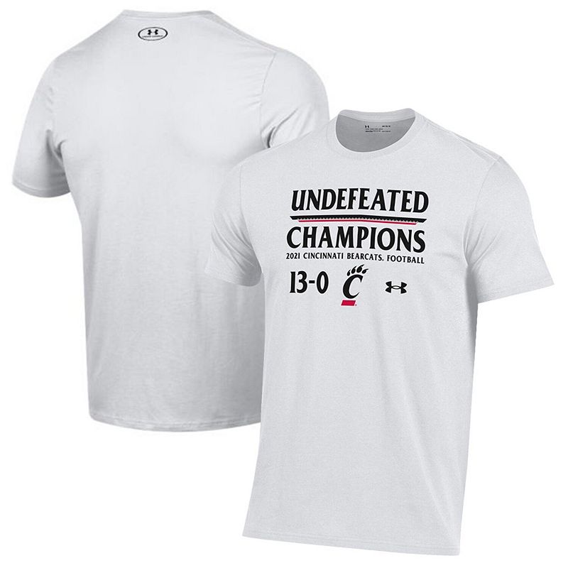 Men's Under Armour White Cincinnati Bearcats 2021 AAC Football Conference Champions Undefeated T-Shirt, Size: SmallTell the world how proud you are to be a loyal Cincinnati Bearcats fan when you grab this 2021 AAC Football Conference Champions Undefeated T-Shirt. This Under Armour gear is the perfect addition to your wardrobe for celebrating your team's perfect season. The bold Cincinnati Bearcats graphics will make this your go-toUnder Armour