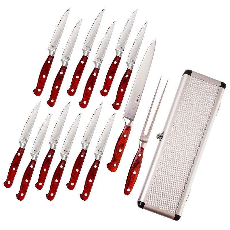 BergHOFF Pakka Wood 15-piece Stainless Steel Steak & Carving Knife Set, BrownThe BergHOFF Pakka Wood 15-piece Stainless Steel Steak & Carving Knife Set is designed for entertaining. This set includes steak knives and a carving knife with elegant handles. FEATURES Triple Riveted, Comfort Grip These knives are equipped with triple-riveted, comfort-grip handles that provides a safe and firm grip fBergHOFF