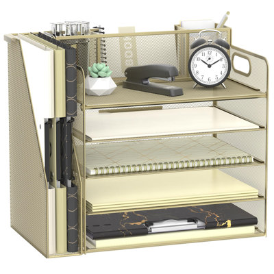 Desk Organizer With File Holder, 5 Tier Desktop File Organizer With 3 Pen Holders, Paper Letter Tray For Office Home Organization & Storage, Mesh DeskThis gold desktop organizer is designed with 5 paper plates, 3 pen holders and 1 magazine folder for office organizing and storage. Sliding boxes are perfect for storing paper, letters, documents, mail, etc. The top pen holder is suitable for pencils, binders and small notebooks. At the same time, your large folders, mHokku Designs