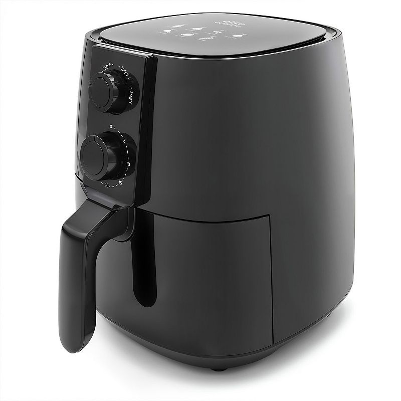 Elite Cuisine 4Qt. Adjustable Time/Temperature Air Fryer, BlackEnjoy healthier, crispier meals with the Elite Cuisine 4Qt. Air Fryer, featuring a 4-quart capacity and easy-to-use controls for oil-free frying, cooking, or baking.WHAT'S INCLUDED Includes Air Fryer base, tank & rackCONSTRUCTION & CARE Plastic, stainless steel Dishwasher safe accessories, Hand washDETAILS 11.42in H xElite