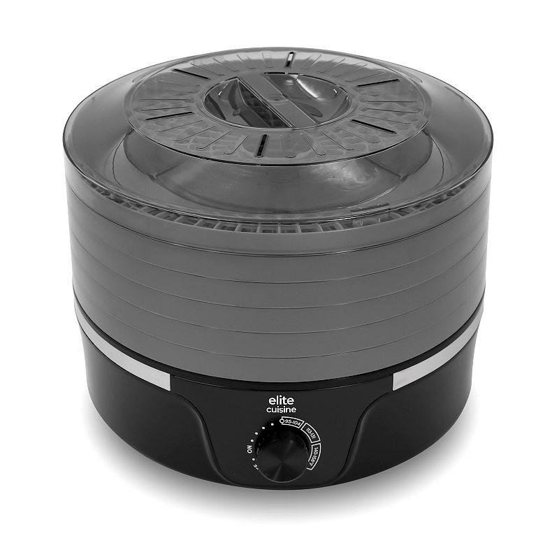 Elite Cuisine Food Dehydrator with Adjustable Temperature Dial and 5 Trays, BlackMake low-calorie snacks with the Elite Cuisine 5-Tier Food Dehydrator, featuring adjustable temperature and BPA-free trays for consistent drying.WHAT'S INCLUDED Includes dehydrator body and 5 BPA free drying traysCONSTRUCTION & CARE Plastic Dishwasher safe accessories, Hand washDETAILS 8.58"H x 11.61"W x 11.61"L ProducElite