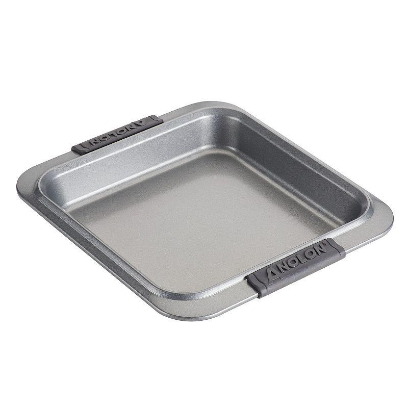 Anolon Advanced Nonstick Bakeware 9-Inch Square Cake Pan, GrayHome chefs have the ideal bakeware piece to prepare desserts and other dishes with the Anolon Advanced Nonstick Bakeware 9-Inch Square Cake Pan with Silicone Grips. Heavy-gauge steel construction resists warping and provides the even heat distribution fundamental to baking. The cake pan's medium color tone aids in beauAnolon