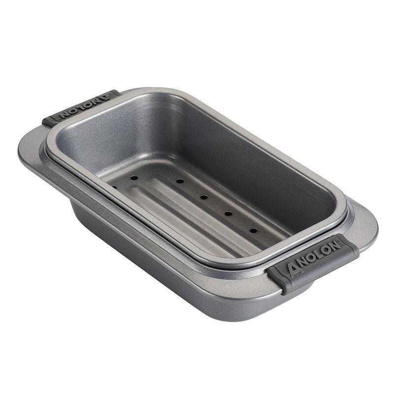 Anolon Advanced Nonstick Bakeware 2-Piece Loaf Pan Set, GrayThe innovative Anolon Advanced Nonstick Bakeware 2-Piece Loaf Pan Set with Silicone Grips is designed to measure up to the high standards of serious cooks, and make baking easier and more efficient. Perforated insert circulates heat and air, and drains unwanted fats away from foods Heavy-gauge steel construction resistAnolon