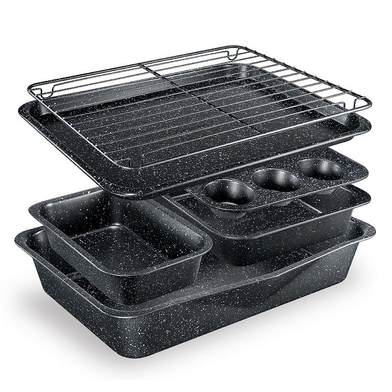 Granitestone Diamond StackMaster 6-pc. Stackable Nonstick Bakeware Set, BlackThis Granitestone Bakeware features a mineral-infused granite coating that offers the perfect blend of nonstick, durability and ease of use. Each piece is pressed from a single sheet of aluminum and layered 3 times with a proprietary coating for the ultimate nonstick experience which requires no oil, making healthy bakGranite Stone Diamond