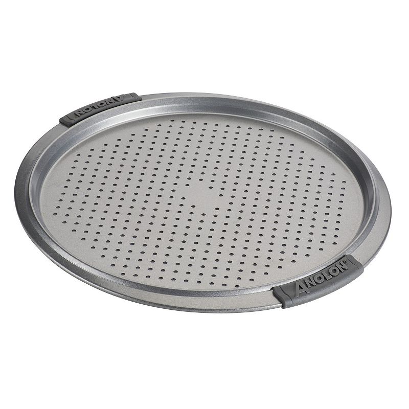 Anolon Advanced Nonstick Bakeware 13-in. Pizza Crisper, GrayPerfect for crusty homemade pizza, calzones and more, the Anolon Advanced Nonstick Bakeware 13-Inch Pizza Crisper with Silicone Grips is designed to make baking easier and efficient, and measure up to serious chefs' high standards. Heavy-gauge steel construction resists warping and provides the even heat distribution fAnolon