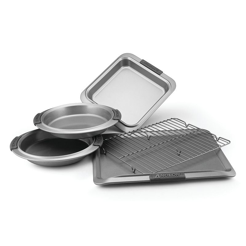 • Anolon Advanced Nonstick 5-pc. Bakeware Set, GrayReady to stand up to daily baking, this Anolon Advanced nonstick bakeware set lets treats slide right off.PRODUCT FEATURES Heavy gauge steel construction resists warping and provides even heat distribution Distinctive medium color tone promotes even browning Durable nonstick surface inside and out provides optimum food