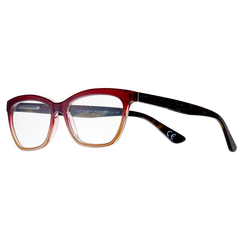 Women's Modera by Foster Grant Kara Ombre Wayfarer Reading Glasses, Size: +2.5, RedThese women's Foster Grant reading glasses are designed to keep your look on point while reducing eye strain and headaches. Frame material: plastic Frame color: wine & brown ombre Lens material: acrylic Durability: scratch resistant Case: soft pouch with microfiber cleaning cloth Model number: 1019031 FIT DETAILS Eye/bFoster Grant