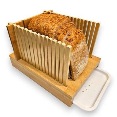 Bamboo Bread Slicer With Crumb Tray Adjustable Bread Slicing Guide Foldable Compact Cutting Board Makes Cutting Bagels Or Even Bread Slices EasyThis product is made from sustainable and biodegradable bamboo, making it an environmentally responsible alternative to plastic alternatives. With an adjustable guide, it can precisely cut bread of various thicknesses, ensuring consistent and customizable results. With a durable construction, the rugged design ensuresPRIMEX CABINETRY, INC.
