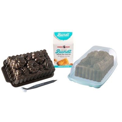 Nordic Ware Fall Loaf Bundle: Harvest Bounty Loaf, Loaf Keeper, Salted Caramel Quick bread Mix & Bundt Cleaning ToolAdorned with pumpkins, acorns and pinecones, this pan is sure to impress your friends and family. Create intricate details without the fuss of decorating by hand-the pan does the work for you. Once baked, you can store your loaf in the handy loaf keeper. Once it's time for clean up, the nonstick allows for easy cleaninNordic Ware