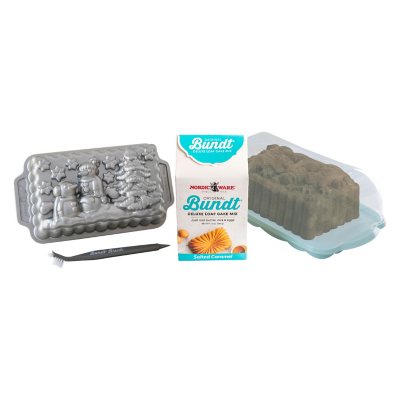 Nordic Ware Holiday Loaf Bundle: Winter Wonderland Loaf Pan, Loaf Keeper, Salted Caramel Quick Bread Mix, Cleaning ToolThe Nordic Ware loaf baking set includes everything for the perfect seasonal loaf; the winter wonderland loaf pan, salted caramel loaf mix, loaf keeper and cleaning tool! This loaf has a sweet wintery scene, complete with fluffy snowdrifts, snow people and snow-laden boughs. It's made from cast aluminum for capturing tNordic Ware