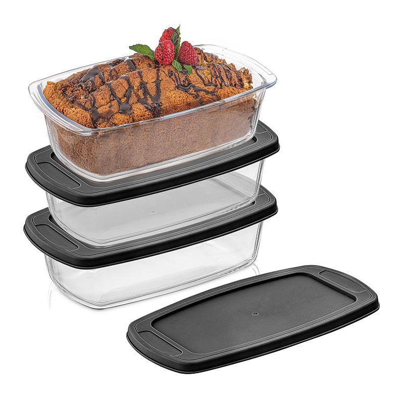 JoyJolt Glass Loaf Pans with Lids, Set of 3, BlackGive your bakeware a refresh with this trio of glass loaf pans with lids from JoyJolt. Give your bakeware a refresh with this trio of glass loaf pans with lids from JoyJolt. FEATURES Leakproof lids Thick & durable Freezer & fridge safe Safe up to 400°FWHAT'S INCLUDED 3 glass loaf pans with lidsCONSTRUCTION & CARE GlassJoyJolt