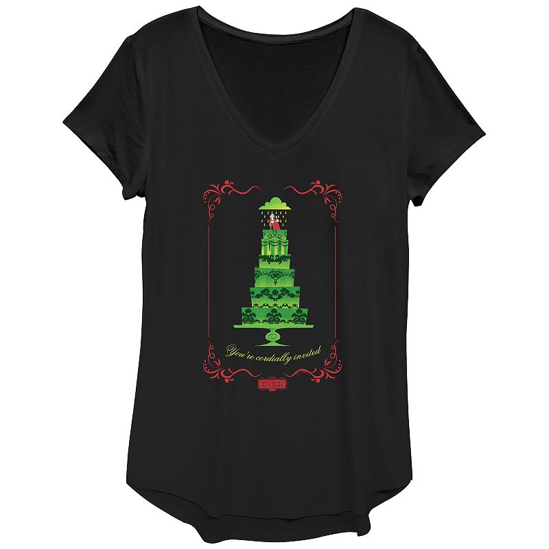 Women's Beetlejuice 2 You're Cordially Invited Wedding Cake Invitation Graphic Tee, Size: XL, BlackShe'll love the look and feel of this Women's Beetlejuice 2 You're Cordially Invited Wedding Cake Invitation Graphic Tee. FEATURES V-neck Short sleevesFABRIC & CARE Polyester, rayon, spandex Machine wash Imported Size: X Large. Color: Black. Gender: female. Age Group: adult.Licensed Character