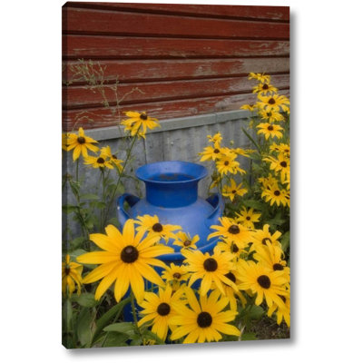 'Wa, Blue Milk Can Sits Amid Garden Flowers' Photographic Print on Wrapped CanvasThis wall art is created on the finest quality artist-grade canvas, utilizing premier fade-resistant archival inks that ensure vibrant lasting colors for years to come. Every detail of the artwork is reproduced to museum quality specifications by our talented graphic artists. The gallery wrap process allows you to hangAugust Grove