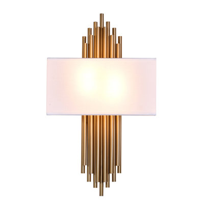 This Wall Sconce Is In A Gold Finish. The Frame Is Made Out Of Metal, And It Comes With Gold Metal Rods And A White Fabric Shade. It Can Be Used In AnEmbrace luminous elegance with this flush-mounted sconce. Designed for modern settings, this fixture casts a warm, inviting glow, perfect for creating ambiance in your bathroom or vanity area. The sleek design seamlessly blends with any decor. Everly QuinnEverly Quinn