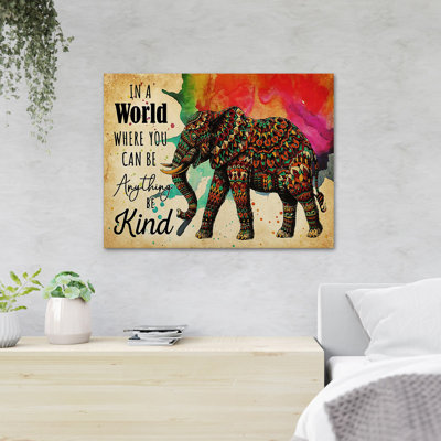 Flower Patterned Elephant - In A World Where You Can Be Anything Be Kind - 1 Piece Rectangle Graphic Art Print On Wrapped CanvasAll pleasure is ours to have your attention on our finest canvas! This product is one of the indispensable items to highlight your room with impression and luxury. Also, it is such an excellent idea to make it a gift to your dearest ones! Trinx Size: 24" H x 36" W x 2" DTrinx