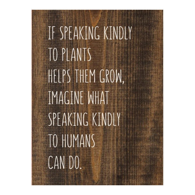 If Speaking Kindly To Plants Helps Them Grow, Imagine What Speaking Kindly To Humans Can Do. (Farmhouse Sign)You will love our farmhouse style signs in classic barnboard colors. Proudly made with solid knotty pine making each piece unique even with natural imperfections. Trinx Color: Dark Walnut/WhiteTrinx