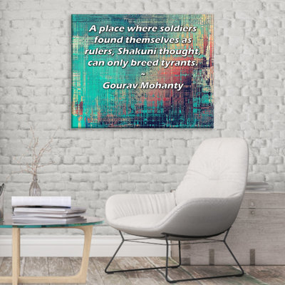 ArtsyQuotes Gallery Wrapped Canvas By Gourav Mohanty: "A place where soldiers found themselves as rulers, Shakuni thought, can only breed tyrants."Museum quality fine art giclee reproduction printed on artist grade canvas. Wrapped and framed in a two inch black ornate wood frame. World Menagerie Overall Size: 40" H x 28" WWorld Menagerie