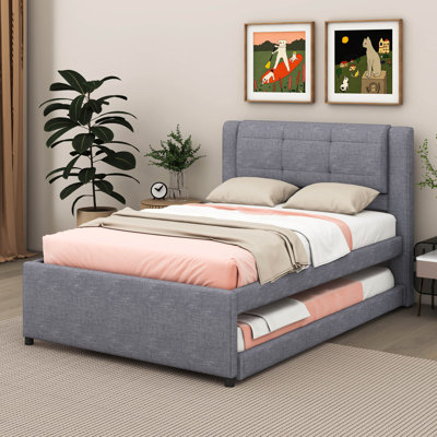 Ovilla Full Size Upholstery platform bed with Trundle,Trundle can be flat or erectedDesigned for both comfort and convenience, this bed features a luxurious upholstered frame that adds a touch of elegance to any bedroom.The included trundle bed offers added versatility, allowing you to easily accommodate guests or extra sleepers. The trundle can be kept flat under the main bed for seamless storage orLatitude Run
