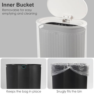 Bathroom Trash Cans White Stainless Steel Small Garbage Can With Pop Up Lid, 1.8 Gallons Dog Proof Narrow Wastebasket, Slim Litter Trash Bins For BedrThe bin has excellent sealing and water resistance, and the pop-up lid fits tightly to the mouth of the bin to avoid garbage exposure and contains all odors. Even in wet places, such as bathrooms, avoid getting the inside of the garbage wet. The lid is designed to effectively prevent your pets from getting into it andXMAX FURNITURE