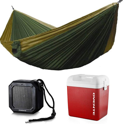 12 Can Portable Outdoor CoolerThe ultimate outdoor camping bundle! Comes with everything you will need to have an amazing time outdoors. Includes: 1 hammock, 6-quart cooler, and a portable waterproof speaker. The hammock is designed to withstand the challenges of outdoor life; this hammock can perform well under heavy rains and winds. Crafted fromOvente