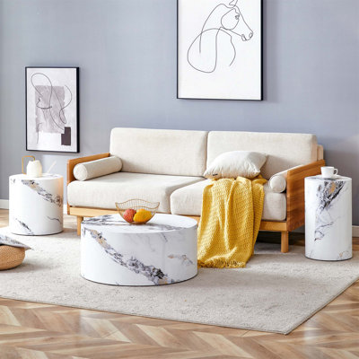 Modern Minimalist Set Of Three Cylinder Marble-Patterned Mdf Coffee Tables,The Cylindrical Table With Its Patterned Design Can Be Easily Integrated InColor Variation Notice: Due to differences in display devices and lighting, there may be a slight color difference between the actual product and the images, which is normal. Multi-Size Set: The coffee table set includes three cylindrical tables in different sizes, measuring 27.5x27.5x12 inches, 12x12x19.7 inches, andIvy Bronx