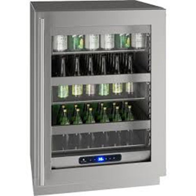 148 Can 24" Undercounter Beverage RefrigeratorThis beverage center can hold 94 (12 oz.) bottles or 148 (12 oz.) cans. It features a convection cooling system, adjustable LED lighting and a soft close door. U-LineU-Line