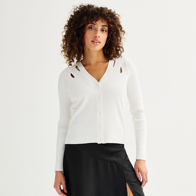 Women's Rachel Roy Cutout Detail Ribbed Cardigan Sweater, Size: Medium, IvoryPerfect your look with this chic cutout detail cardigan from Rachel Roy.Click on this WOMEN'S GUIDE to find the perfect fit and more! Perfect your look with this chic cutout detail cardigan from Rachel Roy. Click on this WOMEN'S GUIDE to find the perfect fit and more! FEATURES Splitneck 4-button front Long sleeves withRachel Roy