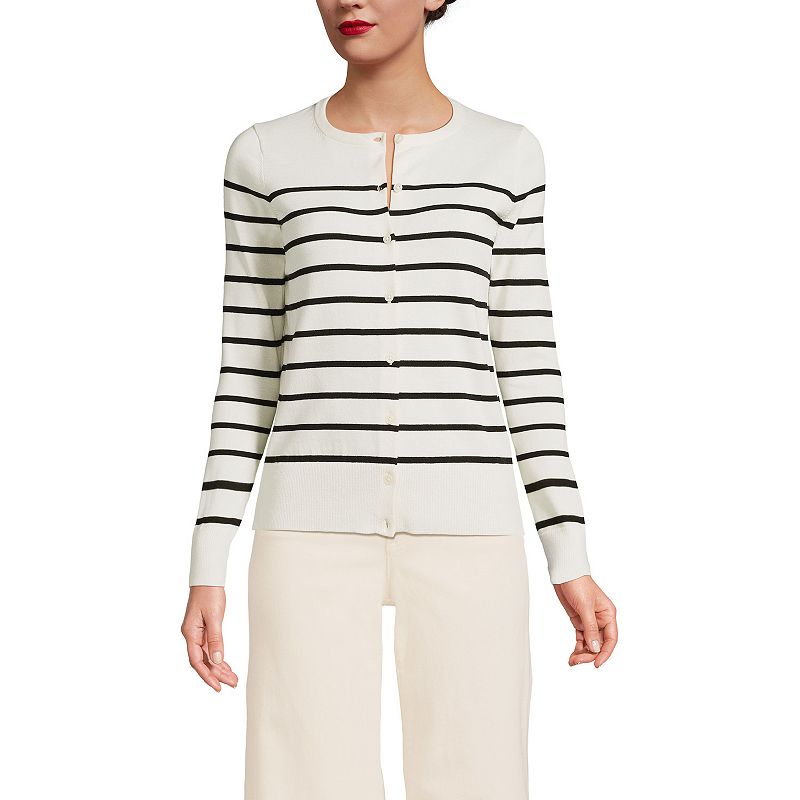 Petite Lands' End Fine Gauge Cotton Cardigan Sweater, Women's, Size: Medium Petite, Ivory Black StripeEveryone needs this cardigan. This women's petite sweater from Lands' End is the ideal weight for indoors without the worry of overheating. The fit offers cleaner, more modern lines that layer well over dress shirts, dresses, tees, and turtles. Ultra-soft, color resilient cotton that's combed for smoothness to resist pLands' End