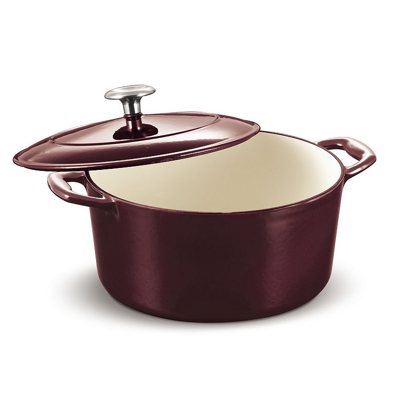 • Tramontina Enameled Cast-Iron 5.5-qt. Dutch Oven, Dark RedFor everything from homemade chili to chocolate upside-down cake, this Tramontina Dutch oven is the perfect choice. Enameled cast-iron ensures superior heat distribution and retention. Porcelain enamel exterior promises a lifetime of easy cleaning. Design is compatible with all stovetops, including induction. Enameled