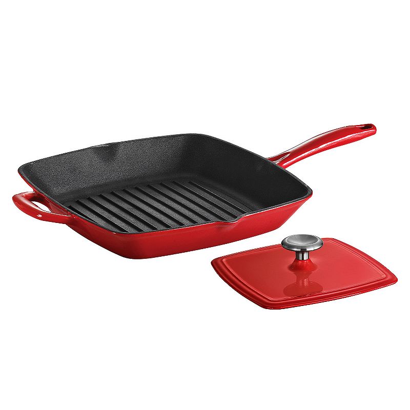 Tramontina Enameled Cast-Iron Grill Pan With Press, RedThis Tramontina grill pan features a durable cast-iron construction that ensures years of high-quality gourmet cooking, while it's heavyweight press promises fast, even results. Enameled cast-iron ensures superior heat distribution and retention. Porcelain enamel exterior promises a lifetime of easy cleaning. DesigTramontina