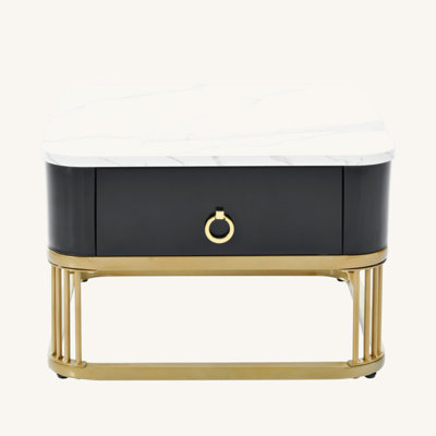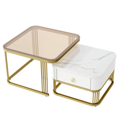 Nesting Coffee Table With Drawer, Exquisite Square Stacking Coffee Tables With Tempered Glass, Side Table With High Gloss Marble Grain Tabletop ,coffeThis coffee table set exhibits an enchanting design that flawlessly merges contemporary aesthetics with timeless allure. Everly Quinn Table Base Color: White/GoldEverly Quinn