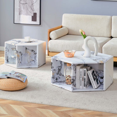 Modern Minimalist Hexagonal Coffee Table Set.Hexagonal MDF Coffee Table, Characteristic Pattern Stickers, Multi-Hole Design To Give More Storage SpaceBlack and White Color Scheme: The coffee tables are made of black MDF material with a sticker featuring white textures, creating a striking black and white contrast that showcases a modern minimalist style.Hexagonal Creative Design: The unique hexagonal shape adds a touch of creativity and personality to the living rooIvy Bronx