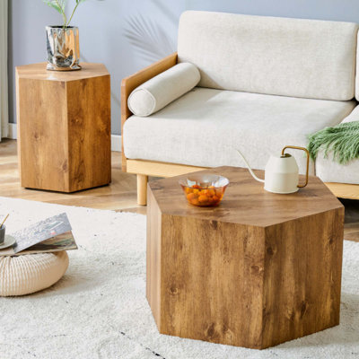 Modern Minimalist Set Of Two Hexagonal Wood-Grain MDF Coffee Tables.Modern MDF Coffee Table, With Complex Texture Patterns, Style And Texture Coffee TCreative Hexagonal Design: Two hexagonal coffee tables in different sizes, measuring 27x23.6x16.5 inches and 18x15.7x19.7 inches, bring a unique geometric aesthetic to the space. Loon PeakLoon Peak