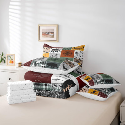 Bear Deer Comforter For Boys, Rustic Cabin Fitted Sheet Queen Size 7 Pieces, Lodge Patchwork Flat Sheet Farmhouse Country Pillow Cases, Vintage AdventThis lodge themed comforter set are the fits setting up your bedroom like a log cabin in the woods.Features deer, log cabins, bears and pine trees for a rustic, outdoorsy look. Shades of grey, green and brown make up the color palette. AMIPORAMIPOR