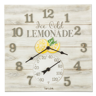 Taylor Precision Products, Lemonade Poly Resin Clock and Thermometer, 14 Inch, Multi-ColorKeep cool on a hot summer day with a refreshing glass of ice-cold lemonade. This lemonade poly resin clock with thermometer has a charming rustic feel and makes for a great addition to the kitchen, patio, or by the pool. The farmhouse lemonade sign is UV and fades resistant. Precision made coils measure temperature reaTaylor