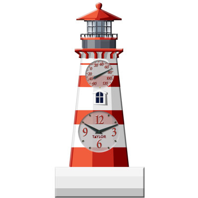 Taylor Precision Products 12" Poly Resin Lighthouse Clock with Thermometer, MulticoloredA carefully hand-painted lighthouse design is ideal for both indoor and outdoor decor. The thermometer measures between -60F to 120F, perfect for year-round use. The dial face is UV and fades resistant so the colors stay vibrant and bold. The thermometer coils are made with precision for accurate readings. The easy-to-Taylor