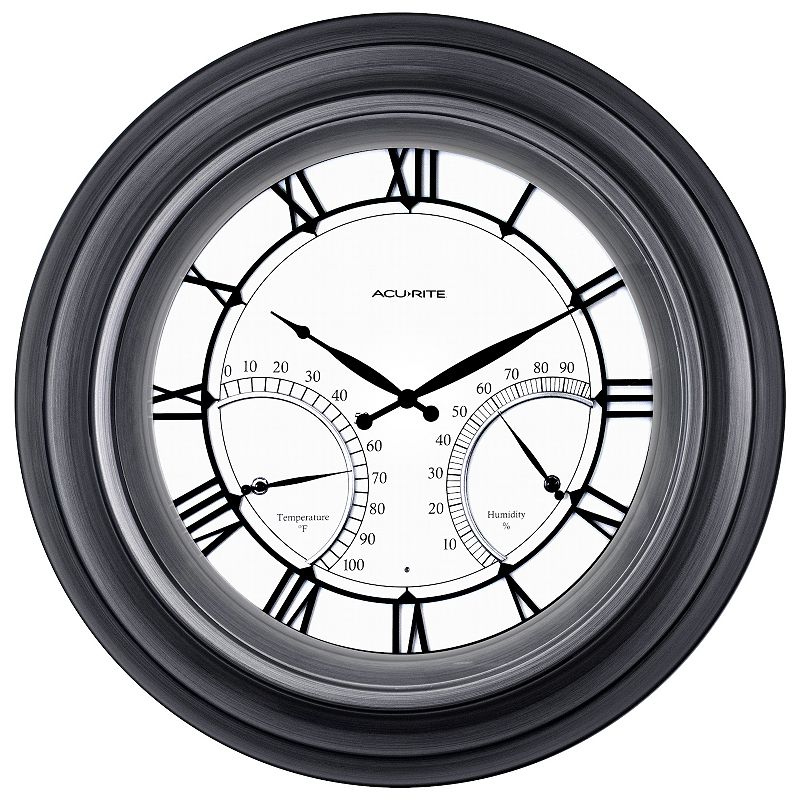 AcuRite Pewter 24-in. LED-Illuminated Indoor/Outdoor Wall Clock with Thermometer & Hygrometer (75026M)View the time, temperature and humidity from a glance with the help of this AcuRite 24-in. LED-illuminated wall clock. View the time, temperature and humidity from a glance with the help of this AcuRite 24-in. LED-illuminated wall clock. FEATURES Full Dial Illumination Activates in Darkness: Glow duration includes a 4-AcuRite