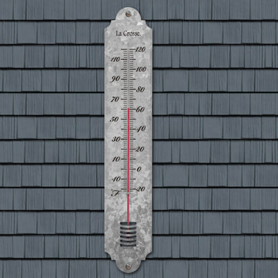 19.50" Metal Outdoor ThermometerThis classic Large Galvanized Metal Thermometer provides an instant reading of the indoor or outdoor temperature. Use the built-in keyhole to hang this analog thermometer on a long nail or screw (not included) and reads temperature in degrees Fahrenheit from -20 up to 120F. The galvanized metal housing is fully weatherLa Crosse Technology
