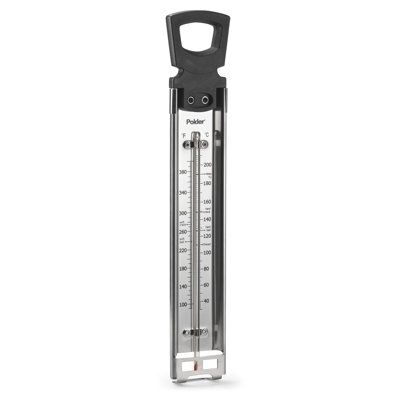 Polder Products LLC Candy/Jelly/Deep Fry ThermometerInsulated handle does not retain heat Easy to read large temperature zones printed directly on unit Pot clip attachment securely holds thermometer in place Temperature range 90F to 400F Manufacturer provides 1 year warranty Temperature Scale: Celsius; Fahrenheit Polder Products LLCPolder Products LLC