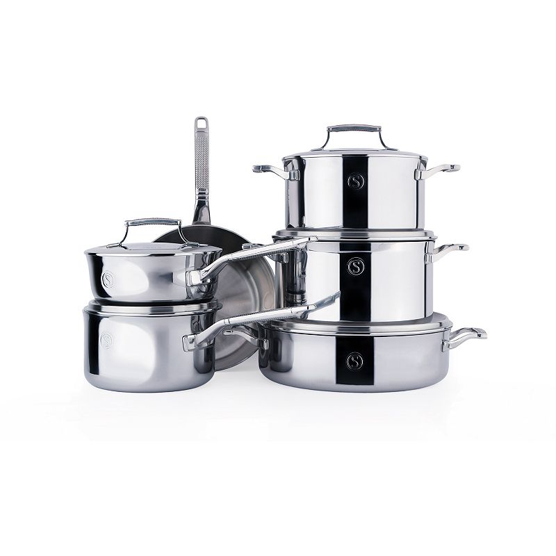 Saveur Selects Voyage Tri-Ply 11-pc. Cookware Set, SilverExpect professional performance when cooking with this Saveur Selects Voyage tri-ply cookware set. Tri-ply 18/10 stainless steel construction with aluminum core for fast, even heat distribution; eliminates food-ruining hot spots Interchangeable double-walled stainless steel lids ensure uniform temperature retention; coSaveur Selects