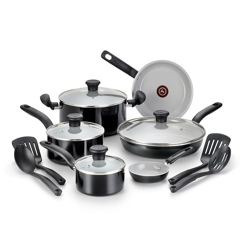 T-Fal Initiatives 14-pc. Ceramic Cookware Set, BlackThis comprehensive T-Fal Initiatives cookware is ideal for a new kitchen or a complete cookware overhaul and includes everything you need for cooking and baking all your favorite foods. FEATURES Ceramic interior for easy, healthy meals Durable aluminum construction: For long lasting performance. Ceramic interior: For nT-Fal